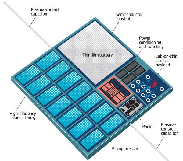 Sprites would have other ways of getting around. Although carrying onboard propellant is impractical, the Sprites’ diminutive size will make them ideal for harnessing the sun’s radiation pressure. Photons carry momentum, and when they strike a surface, they transfer that momentum as force. This force blows dust particles out of the solar system and has also been used to adjust the trajectories of interplanetary probes, including NASA’s Messenger spacecraft, which entered orbit around Mercury in March.